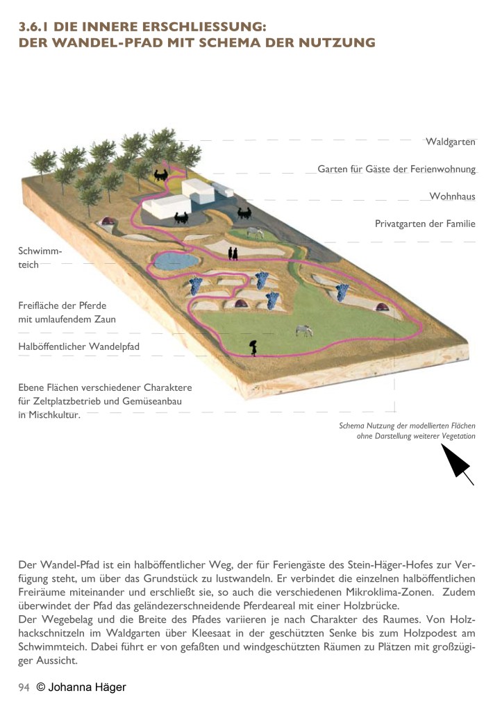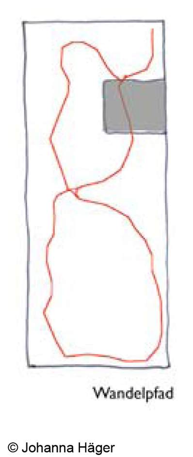 Wie Räume gestaltet sind, hat unmittelbaren Einfluss auf die Menschen – und auf ihre Beziehungen. Permakulturdesign arbeitet nicht nur mit ökologischen Bauweisen und Rohstoffen sondern gestaltet – genauso wichtig – Räume, Wege, Grenzen, Ausblicke, Öffnungen etc. – und wie diese miteinander in Verbindung stehen. Der „Wandelpfad“ verbindet und leitet durch die verschiedenen Zonen, zum Beispiel Zonen ungestörter Privatsphäre und Zonen für Geselligkeit und Zusammenkommen.