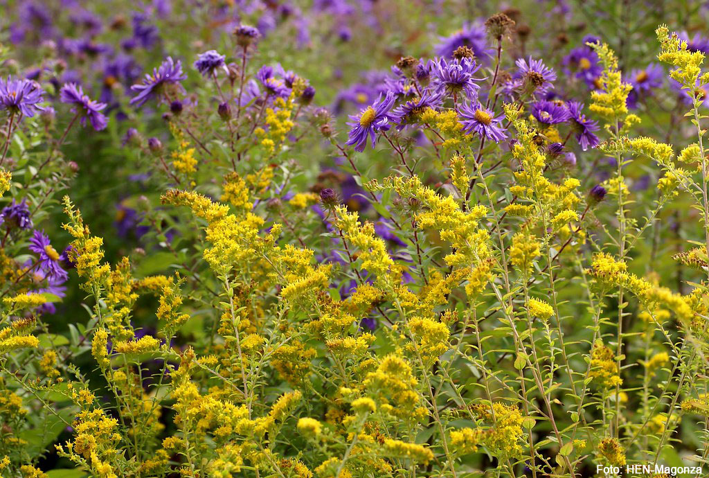 Dabei ist die Frage, warum Astern und Goldrute oft zusammen stehen und so prächtig aussehen, wirklich eine gute wissenschaftliche Frage: Violett und Gelb verstärken sich als Komplementärfarben gegenseitig – jede leuchtet mit der anderen zusammen kräftiger als allein – wir finden das schön, sie fallen auf, auch den Bienen.