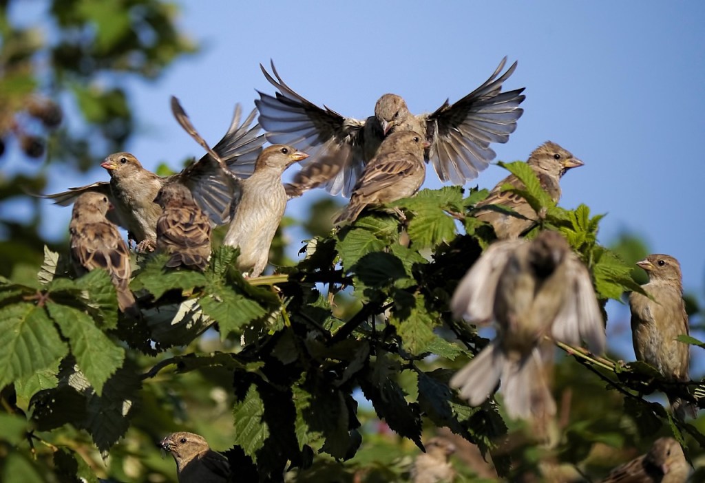 Spatzen: Früher wohnten sie bei uns unterm Dach. Dann mussten wir das Dach erneuern und sie kamen nicht mehr rein, um Nester zu bauen. Trotzdem gibt es jetzt mehr Spatzen. Wir haben Spatzenkästen aufgehängt.